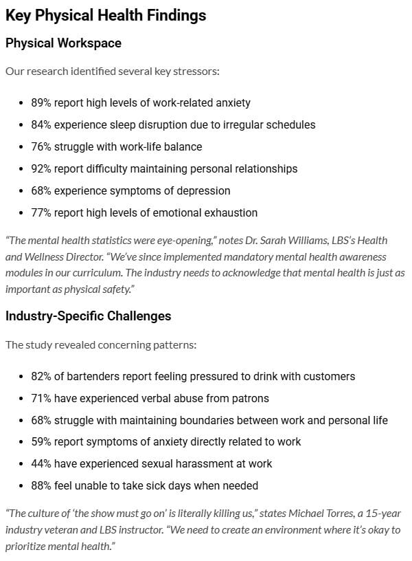 According to the study mentioned in the previous section done by LBS there are some very glaring impacts to mental and social health when it comes to bartending and work in the service industry in general. The best way to show this was just to take a screen grab from the website because there is so much that needs to be taken into account when we talk about the toll this industry can take on every aspect of life.